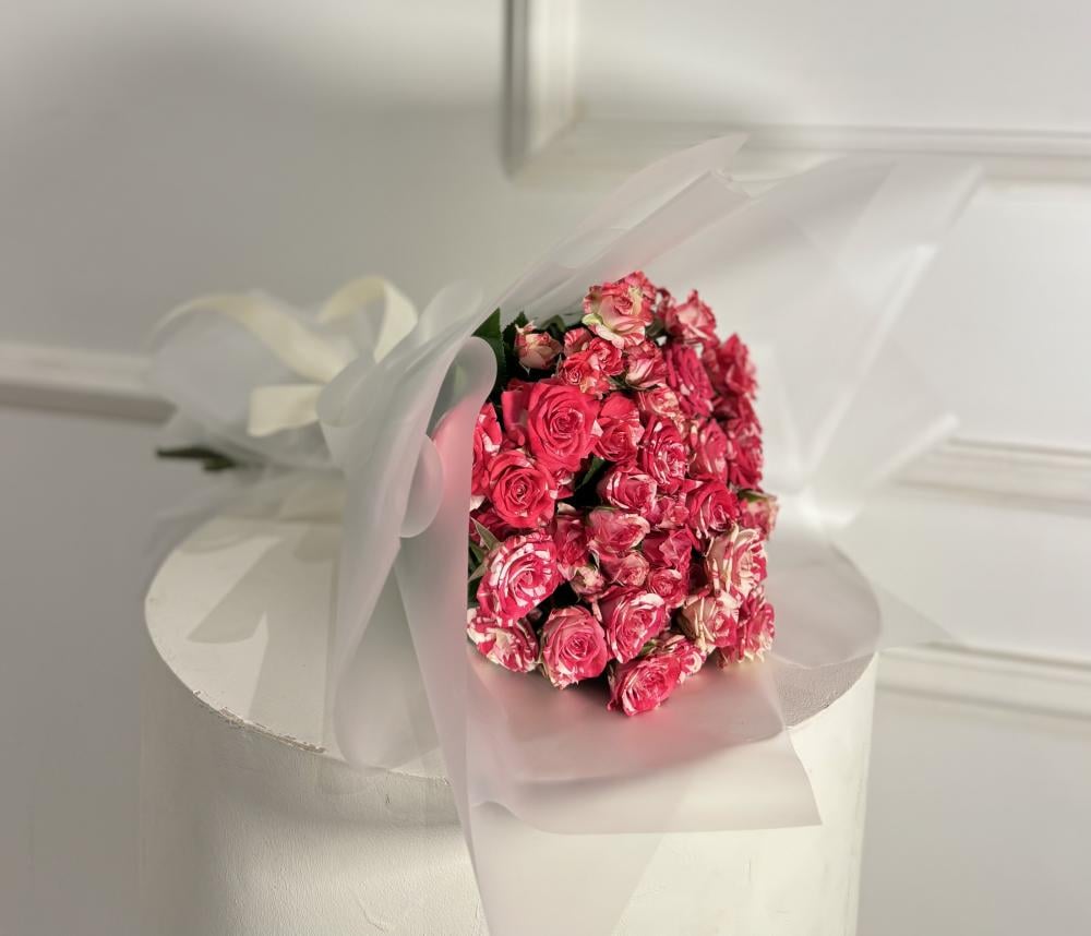 استمتع بجمال باقة رقة الورود التي تجمع بين الجاذبية والرقي في شكلها. تتميز الباقة بورود صغيرة طبيعية بلون وردي حيوي وأنيق، مرتبة بشكل متناسق ومثالي لتكون باقتك المفضلة لجميع مناسباتك المميزة.