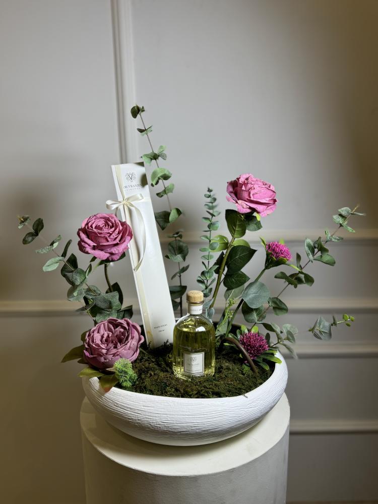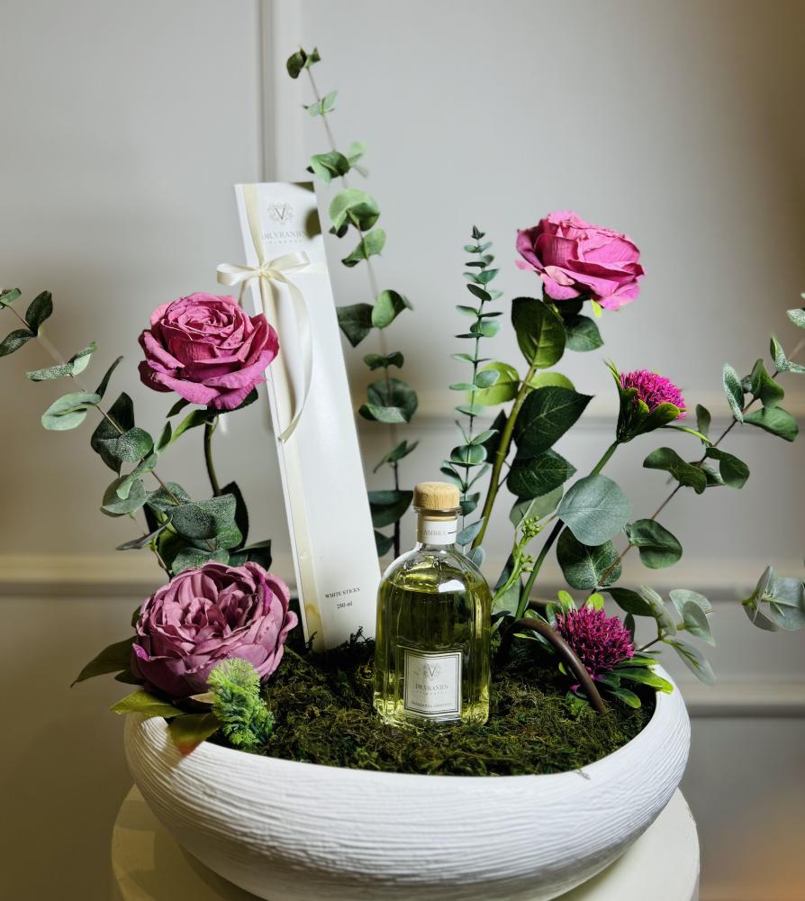 اجعل ركنك ينبض بالفخامة مع تنسيق رونق العطر والزهور. اطلبه الآن من ريف وردتي واستمتع بتصميم يجمع بين الأناقة والرائحة العطرة!