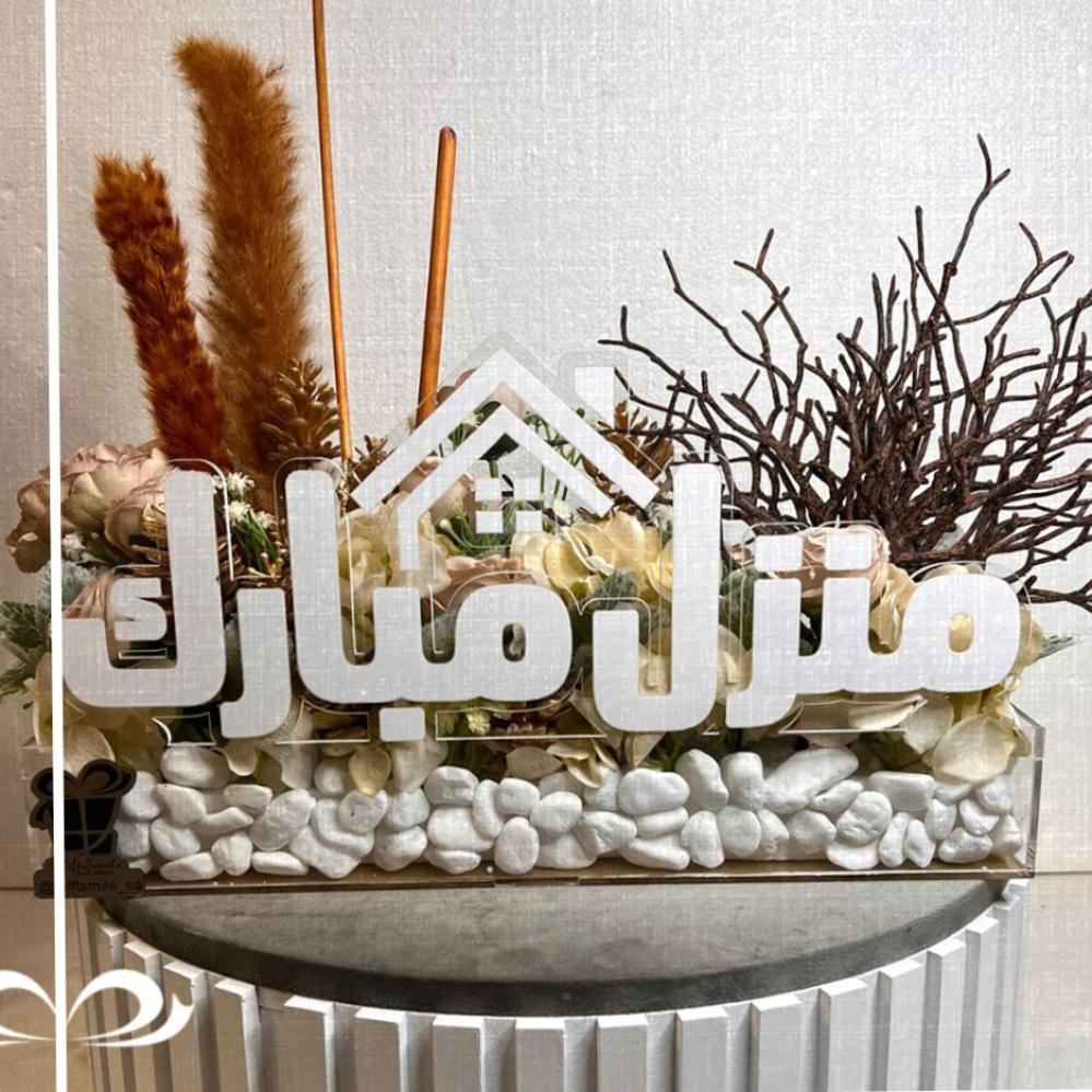 تنسيق زخرفي راقٍ لهدية منزل جديد، يتميز بعبارة "منزل مبارك" بخط عربي جذاب مصنوع من مواد عالية الجودة، متداخل مع زهور دقيقة ونباتات جافة تعكس دفء وجمال الطبيعة، يضيف هذا التنسيق لمسة من الفخامة والدفء إلى أي فضاء، مقدماً تجربة بصرية فريدة ومُرحبة لأصحاب المنزل الجديد وضيوفهم.