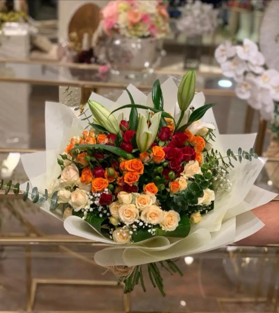 باقة الورد الزاهية بتناسق الطبيعة تجمع بين الروعة والتألق في تنسيق ألوان متناغم يشمل الورود البرتقالية، الحمراء والبيضاء، إلى جانب زهور الزنبق الأبيض التي تضفي لمسة من الفخامة والرقي، هذه الباقة مثالية لتعبر عن مجموعة واسعة من المشاعر من الحب والاحتفال إلى الشكر والتقدير، وتصلح لكافة المناسبات من الأعياد والاحتفالات إلى الأمسيات الرومانسية.